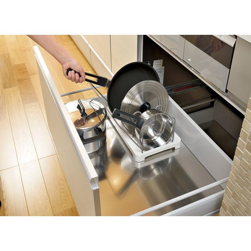 シンク下収納 キッチン収納 フライパン収納 鍋収納 システムキッチン カウンターキッチン 引出し収納 ボウル ザル 鍋 鍋蓋 フライパン 整理 オシャレ スッキリ整理 フライパンスタンド 鍋蓋収納 山崎実業 伸縮式 省スペー 伸縮鍋蓋 簡単組立 ホワイト 3840 直営限定